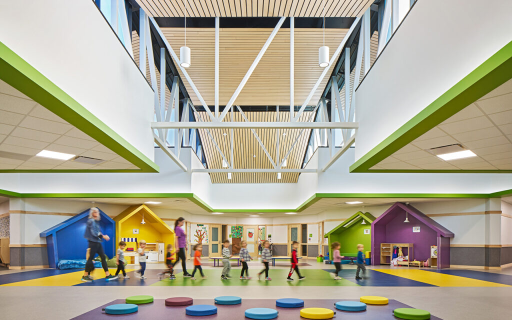 “The Livonia Early Childhood Center features sensory-rich design supporting whole-child development. Accent colors, tactile Braille wallcoverings, and textured walls promote sensory exploration and empathy,” read jury comments.